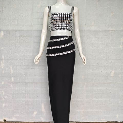 Ss2407 Hoge Kwaliteit Vrouwen Luxe Kristallen Bandage Outfits Mouwloze Crop Top En Lange Rokken Tweedelige Sets
